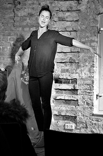 Selbstsicherheit durch ihre Darbietung vor Publikum zu erlangen.